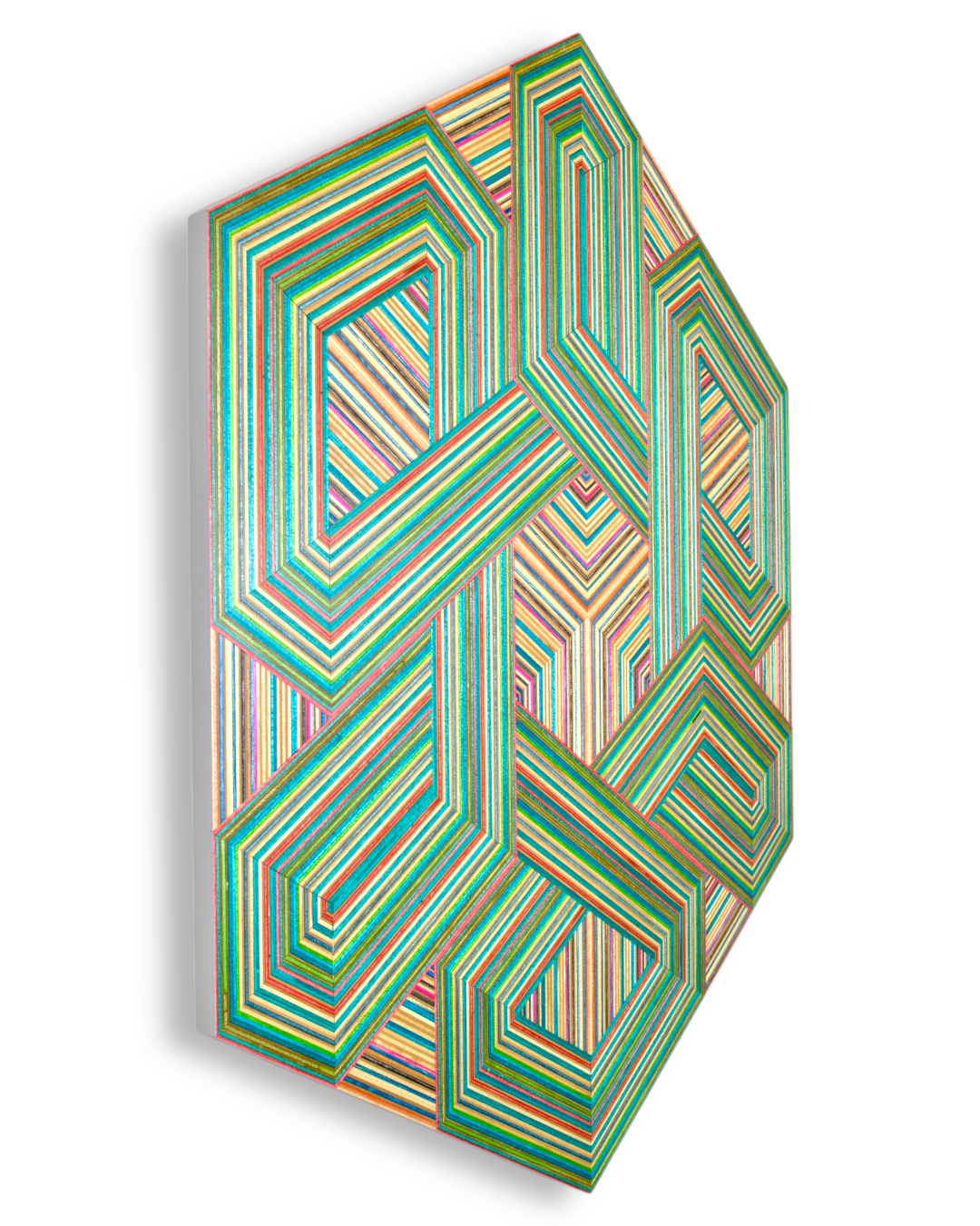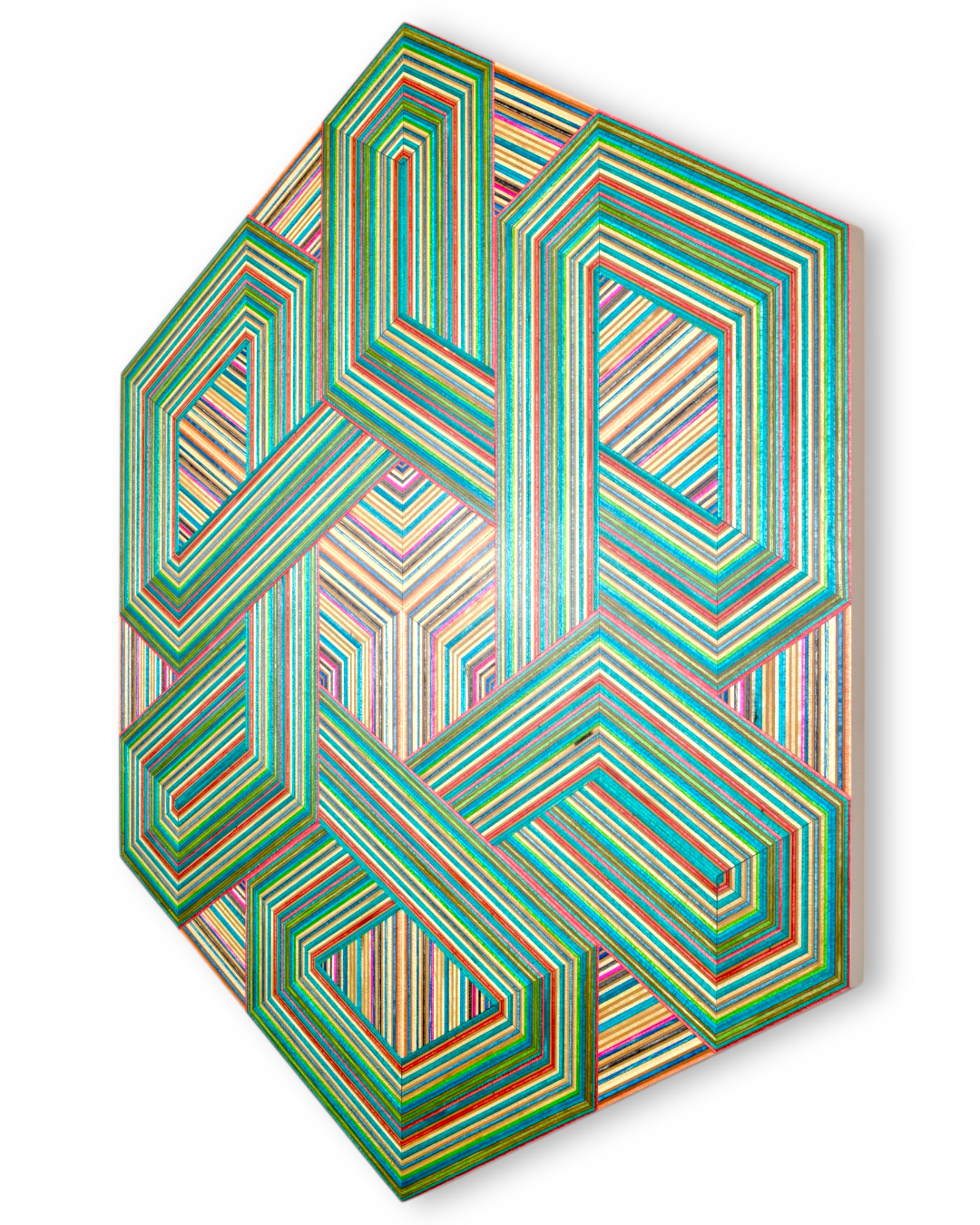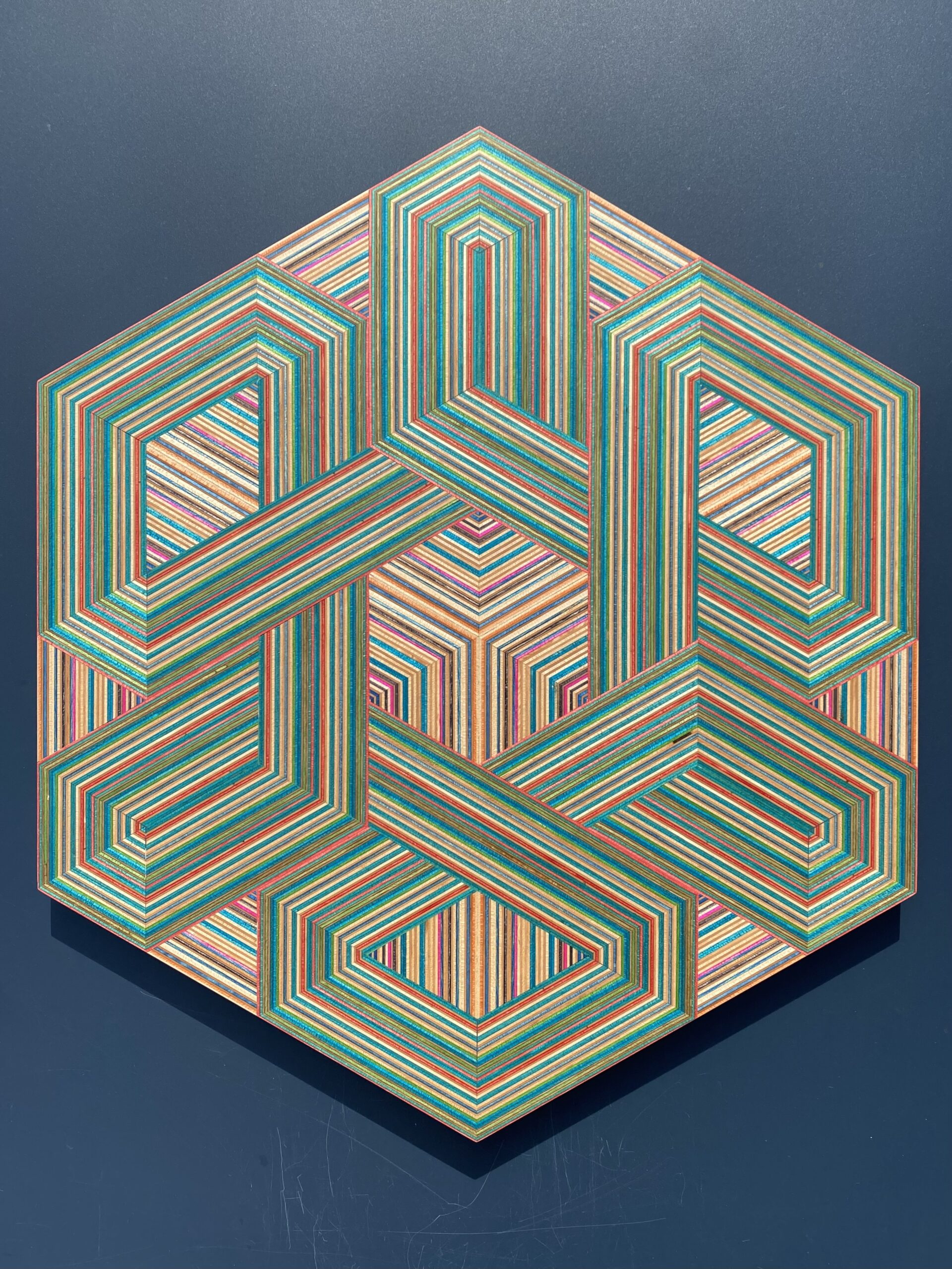The result is a collection of striking geometric artworks that play with perception and challenge the viewer’s eye. The natural variation in the coloured skateboard layers adds depth and movement, creating subtle three-dimensional effects that shift with every glance. Each piece captures the energy, creativity, and layered history of skateboarding in a refined, architectural form.