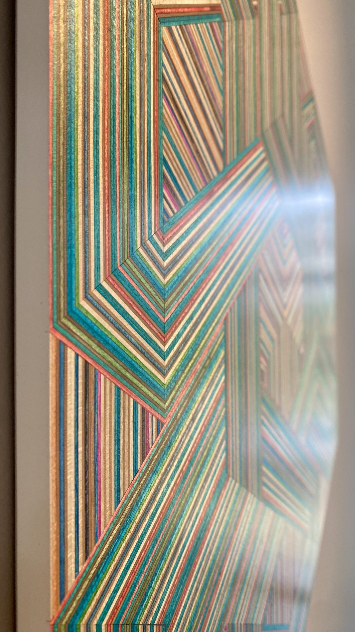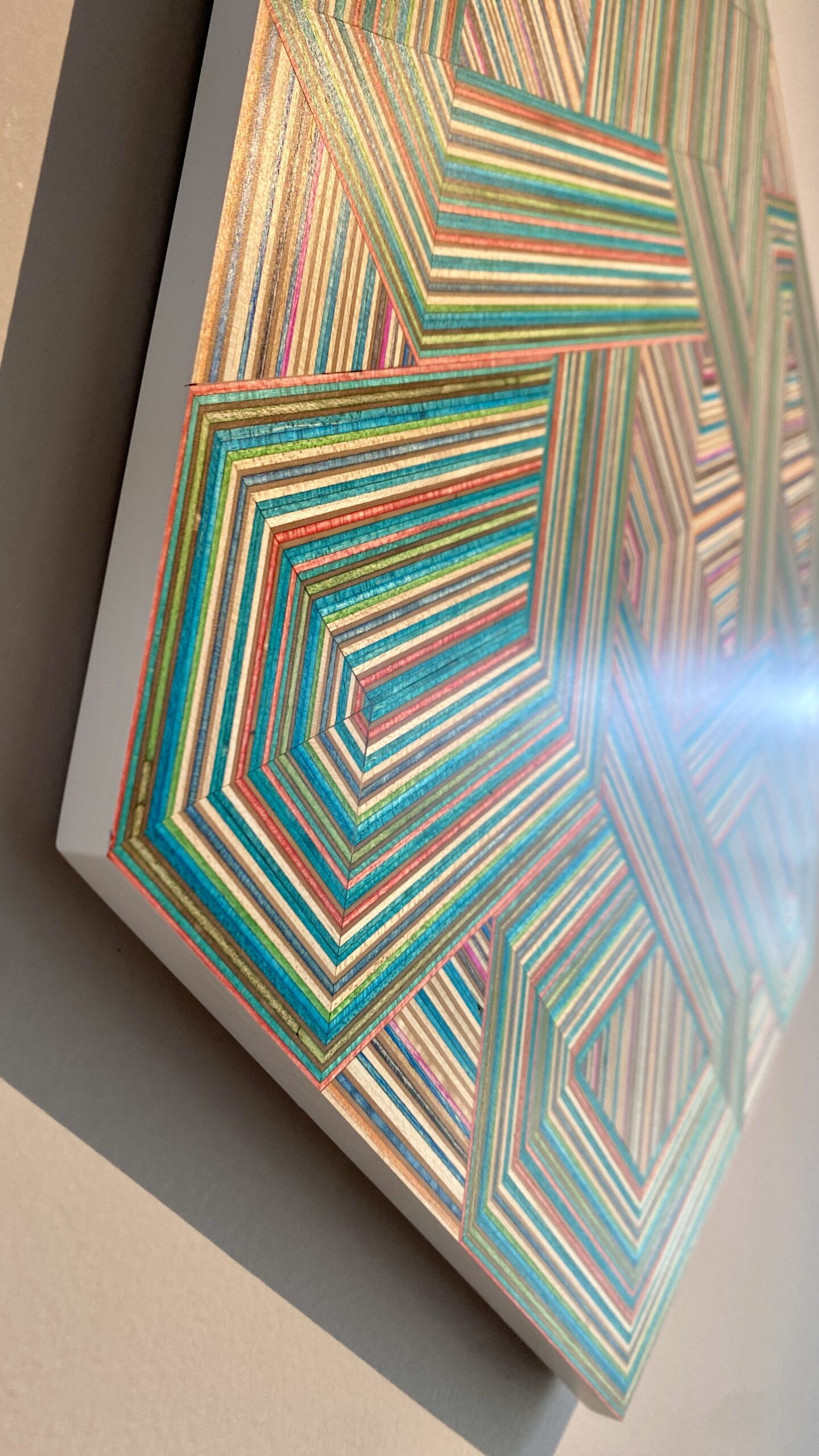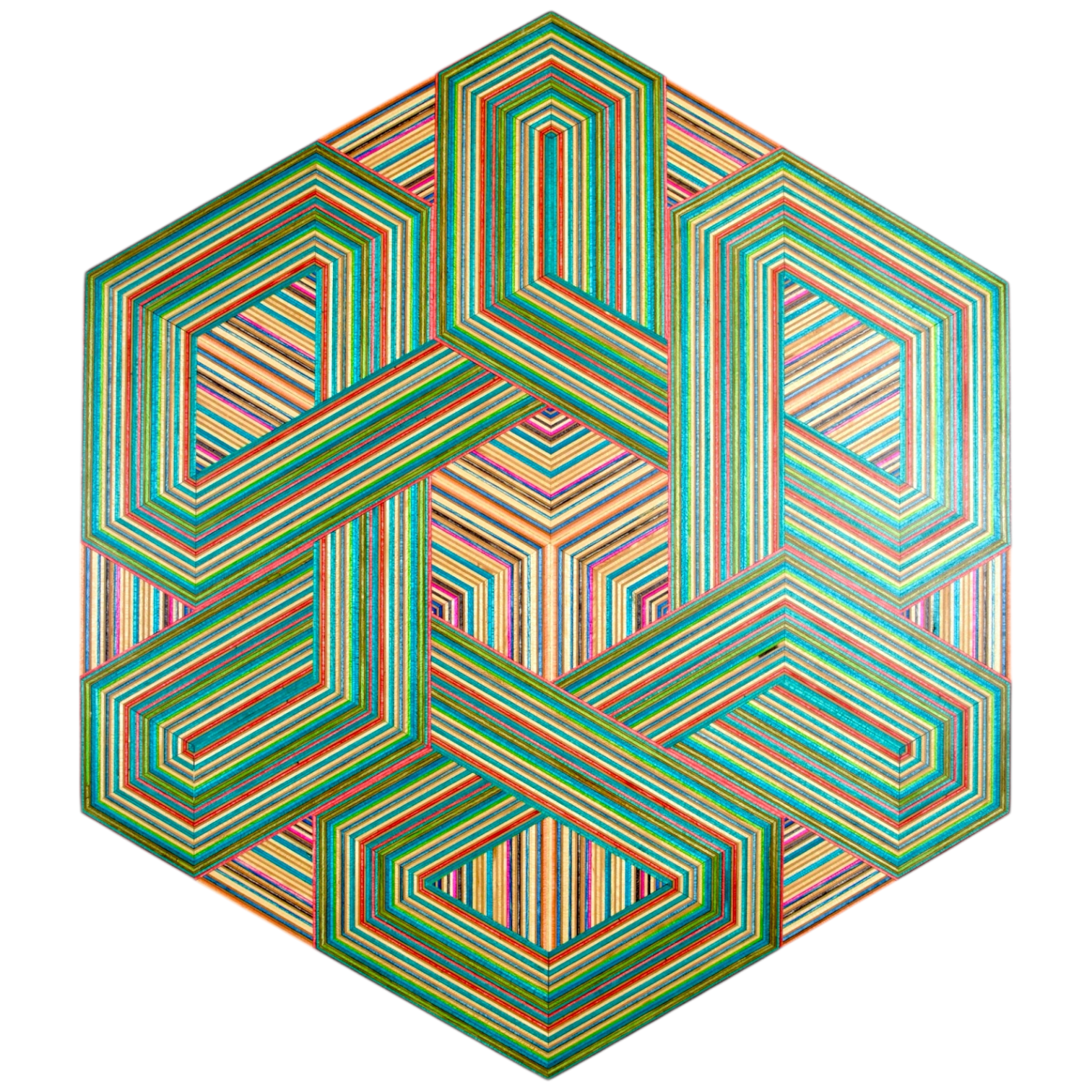 The result is a collection of striking geometric artworks that play with perception and challenge the viewer’s eye. The natural variation in the coloured skateboard layers adds depth and movement, creating subtle three-dimensional effects that shift with every glance. Each piece captures the energy, creativity, and layered history of skateboarding in a refined, architectural form.