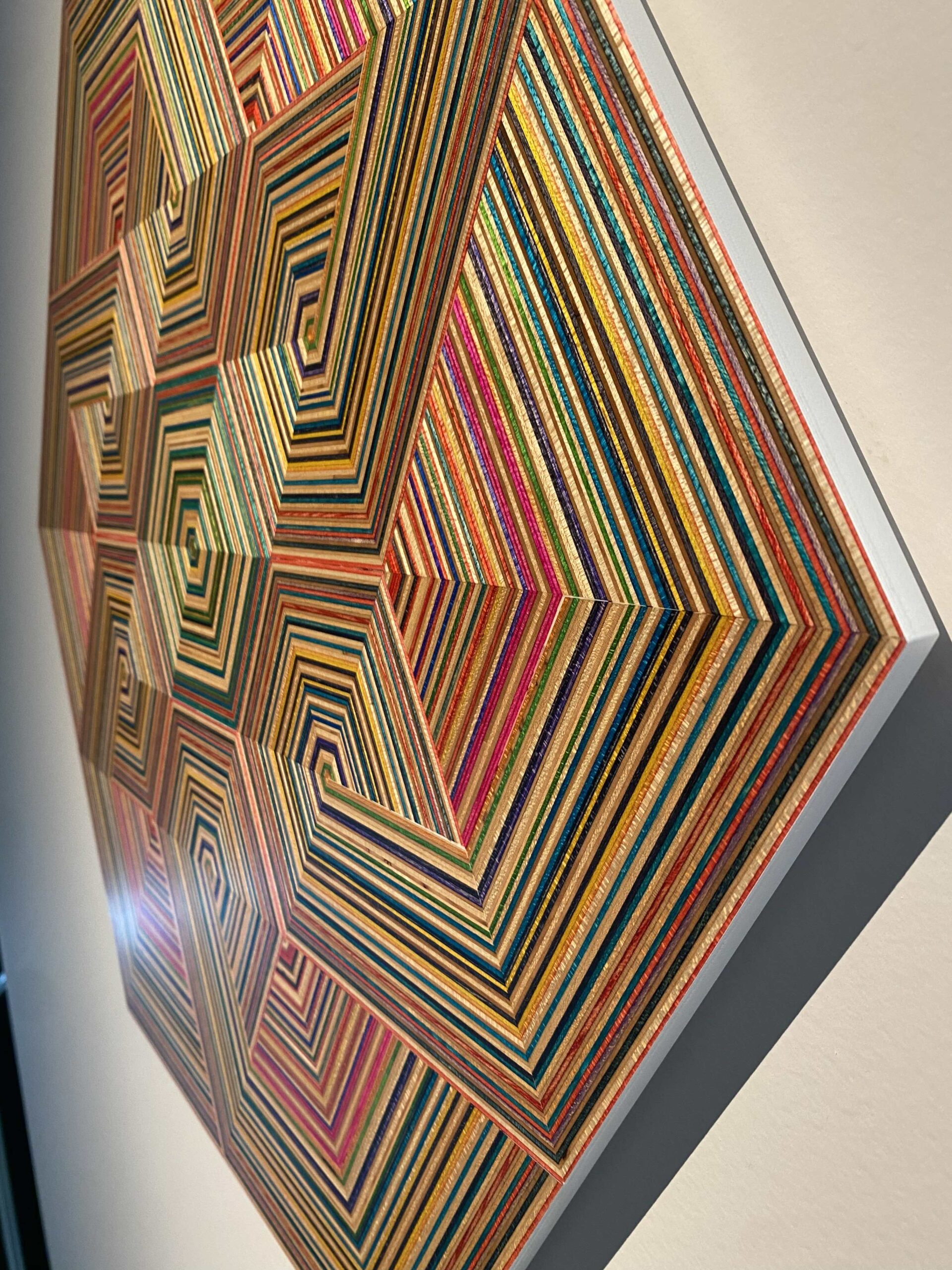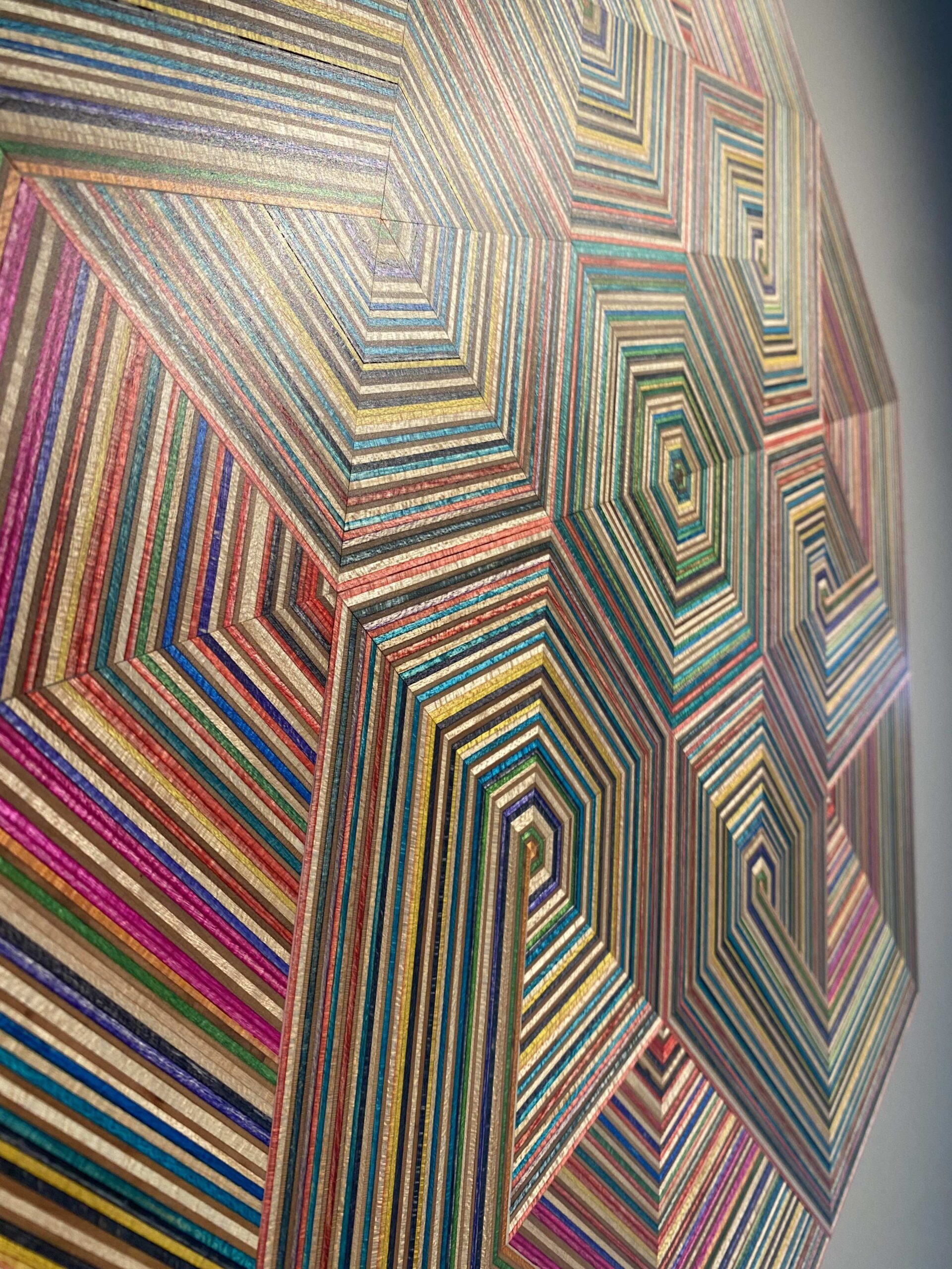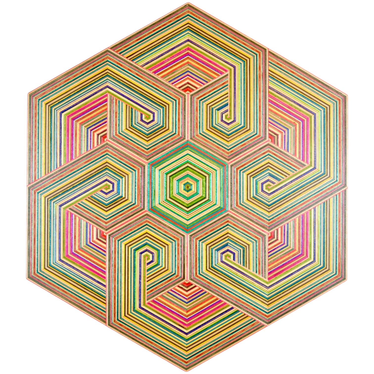 “Ruggamuffin” ~ 2025 is part of our ArtDecko wall art series, which is inspired by the classic tile patterns from the Art Deco art movement of the 1920s and 1930s. After experimenting with translating recycled skateboard lines into these patterns, we discovered that there was a bigger world of geometry behind them with endless possibilities. The experiment resulted in unique geometrical patterns that challenge and play with the viewer’s senses. The colourful skateboard veneers give depth to every pattern, creating three-dimensional effects that change every time you look at the artwork. This way every ArtDecko artwork embodies the playful and creative spirit of skateboarding.