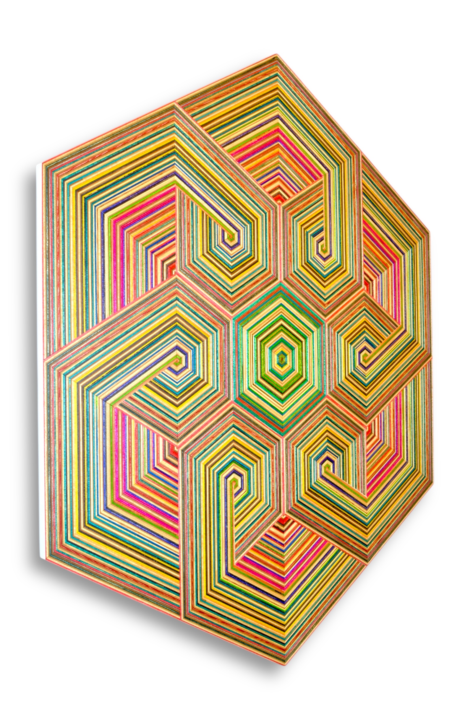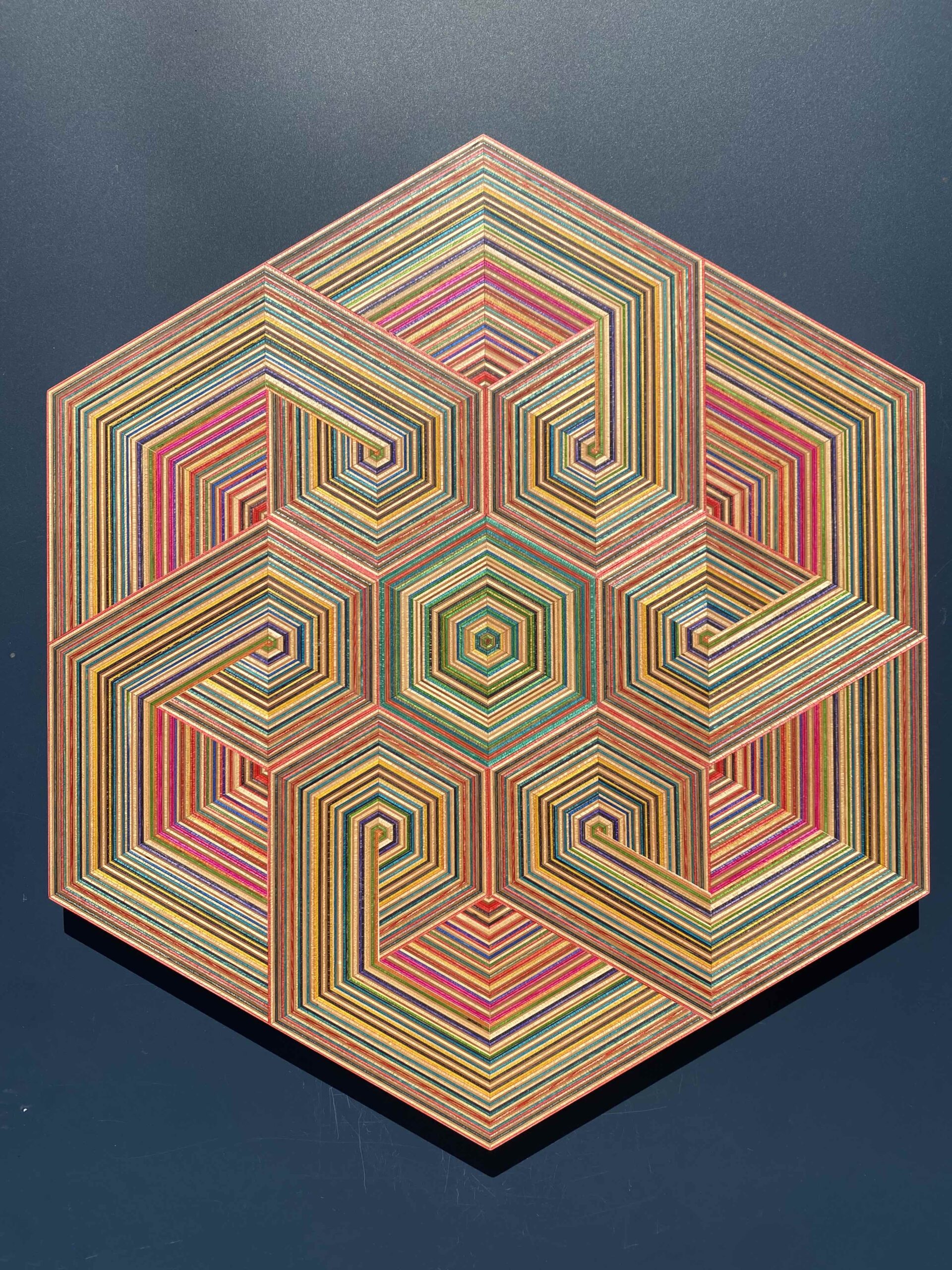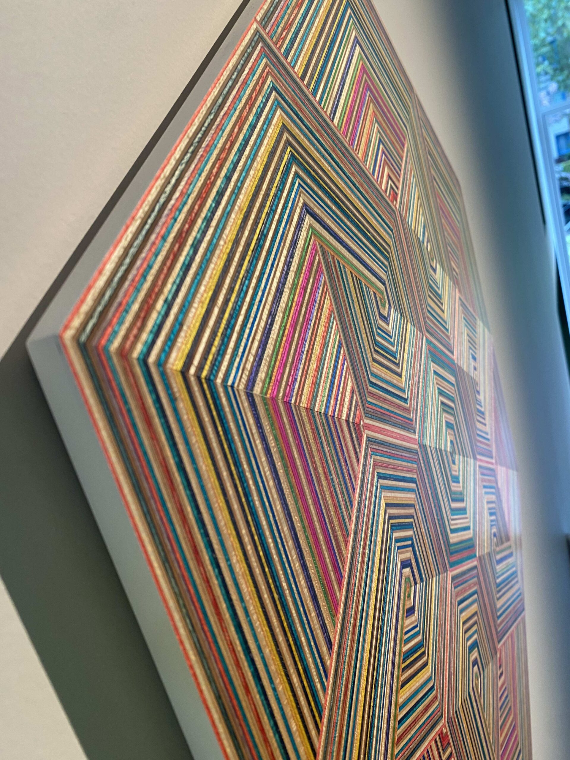 “Ruggamuffin” ~ 2025 is part of our ArtDecko wall art series, which is inspired by the classic tile patterns from the Art Deco art movement of the 1920s and 1930s. After experimenting with translating recycled skateboard lines into these patterns, we discovered that there was a bigger world of geometry behind them with endless possibilities. The experiment resulted in unique geometrical patterns that challenge and play with the viewer’s senses. The colourful skateboard veneers give depth to every pattern, creating three-dimensional effects that change every time you look at the artwork. This way every ArtDecko artwork embodies the playful and creative spirit of skateboarding.