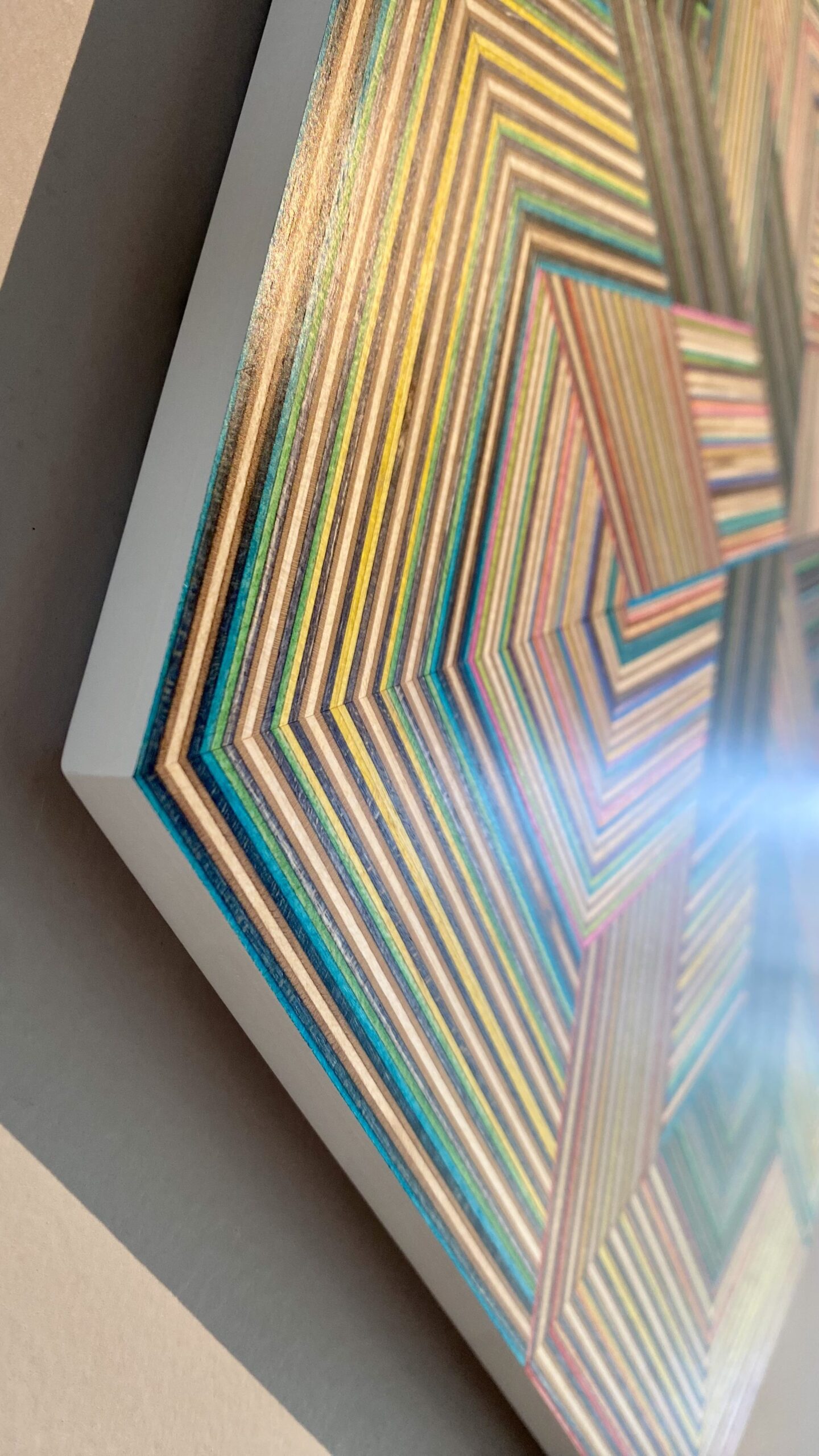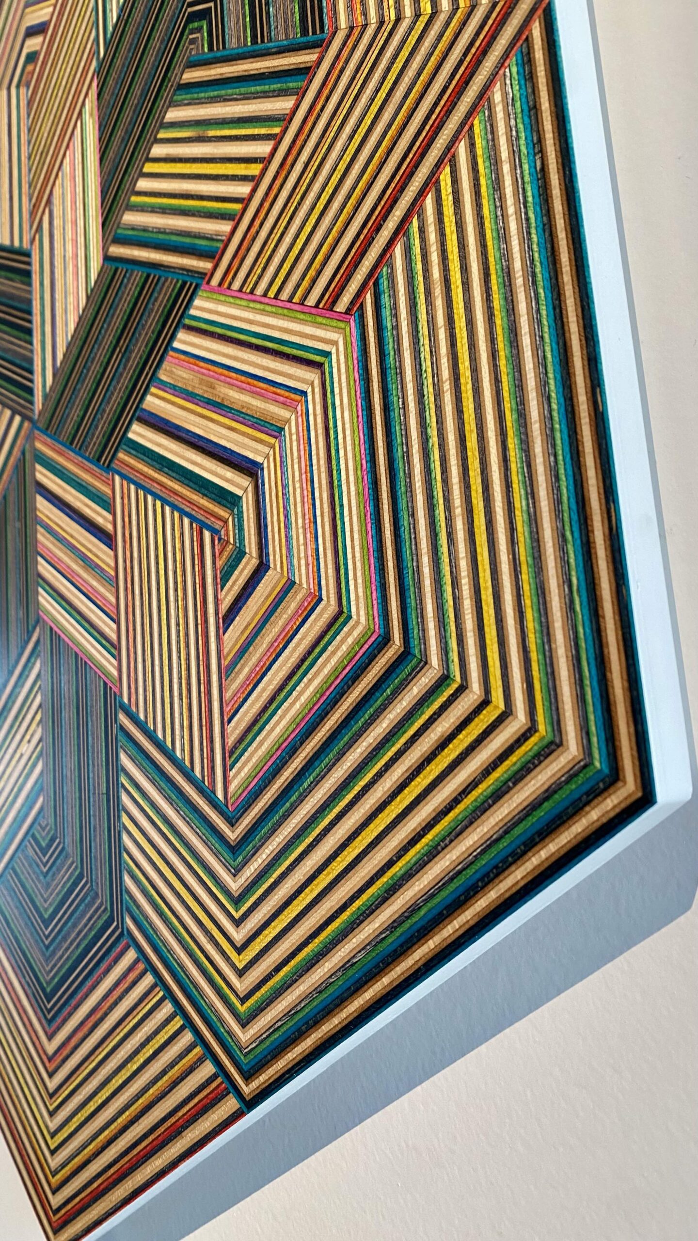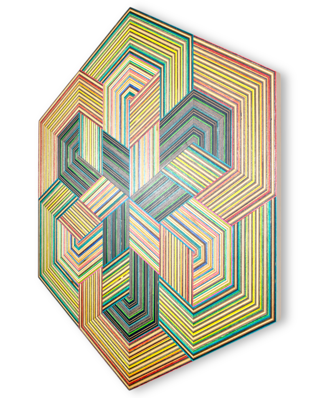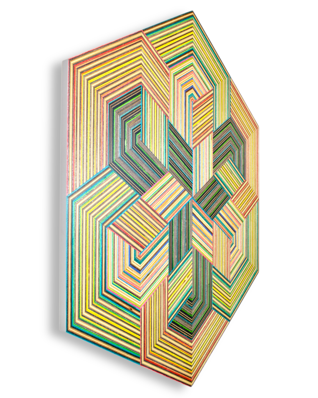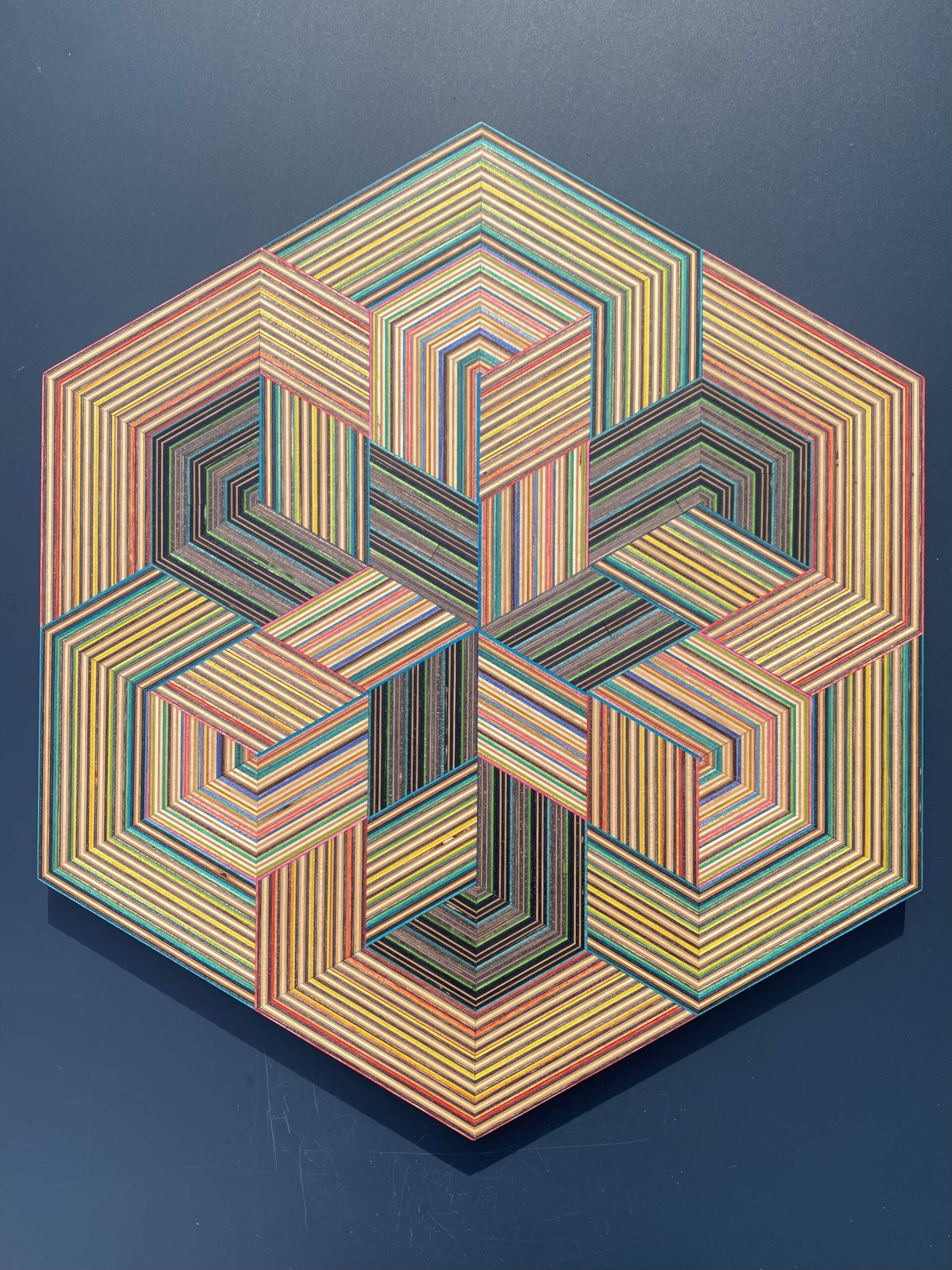 The result is a collection of striking geometric artworks that play with perception and challenge the viewer’s eye. The natural variation in the coloured skateboard layers adds depth and movement, creating subtle three-dimensional effects that shift with every glance. Each piece captures the energy, creativity, and layered history of skateboarding in a refined, architectural form.